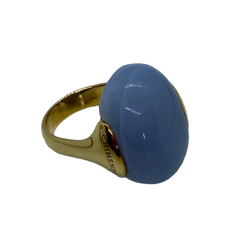 ANELLO MARCA "CHIMENTO" IN ORO GIALLO E ROSA 18 Ct , CON CABOCHON DI CALCEDONIO NATURALE TAGLIATO SU MISURA PER DARE UN EFFETTO CUSCINO , IL GAMBO SI AGGANCIA DA UN LATO CON UN ANELLO IN ORO ROSA ALL'INTERNO DELLA PIETRA CREANDO UN ASIMMETRIA MOLTO ORIGINALE