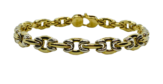 BRACCIALE MAISON "CHIMENTO" IN ORO GIALLO E BIANCO 18K SOPRA , IN ORO GIALLO 18K SOTTO. LA MAGLIA E' MORBIDA , CONFORTEVOLE E ROBUSTA . LA CHIUSURA E' UN MOSCHETTONE DI SICUREZZA. SCATOLA, CERTIFICATO E GARANZIA ORIGINALI.