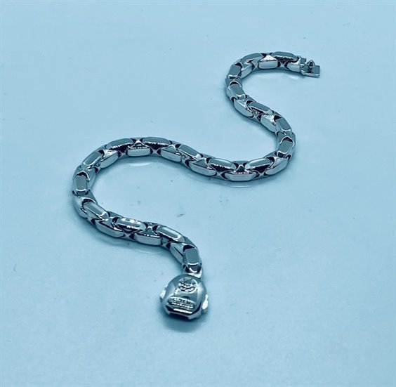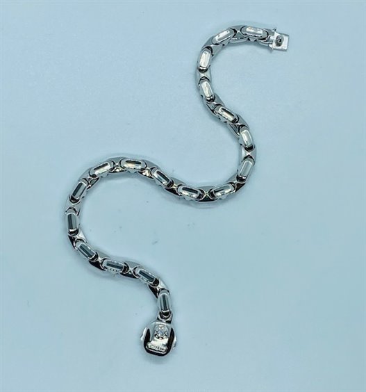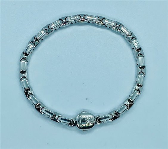BRACCIALE MAISON "CHIMENTO" IN ORO BIANCO 18K CON CHIUSURA DI SICUREZZA A 2 PULSANTI CON INCASTONATO UN DIAMANTINO PER Ct 0,03. LA MAGLIA E' MORBIDA , COMPATTA E MOLTO ROBUSTA. 1 anno di garanzia contro il furto.