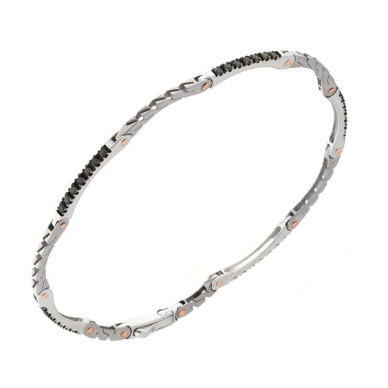 Bracciale tennis a elementi rigidi con diamanti neri alternati da elementi in oro bianco lavorato snodati tra loro (0,56 ct totali) realizzato in oro 18 carati. Struttura flessibile che consente di seguire la curvatura del polso assicurando un comfort e una portabilità 24 ore su 24. Il bracciale misura 19 cm di lunghezza ed è 9,10 gr. di peso.