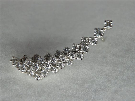 Orecchini in oro bianco 750/1000 pendenti, con diamanti taglio brillante incassati a quattro griffe. Presentano mobilità nella parte finale. Chiusura a paletto con farfallina a pressione.
