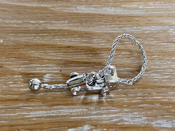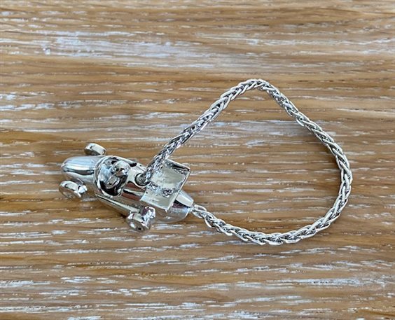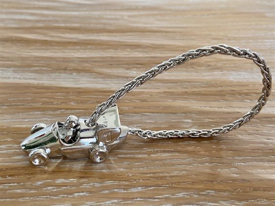 Portachiavi in argento 925 massiccio con raffigurato una robusta Ferrari da corsa d'epoca. La catena è a forma di spiga e chiude con una pallina avvitata di sicurezza .