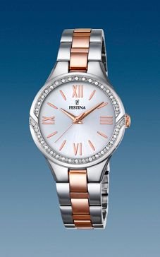 Orologio donna , acciaio 316L , movimento al quarzo solo tempo , cassa mm 32 , quadrante bianco con indici e lancette rosè , vetro minerale , fondello a pressione , zirconi bianchi incastonati sulla cassa , cinturino bicolore , finiture in PVD oro rosè , chiusura a pressione con doppio pulsante. Immagine indicativa , la confezione può variare di forma e colore.