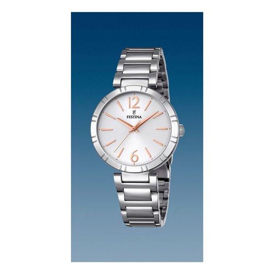 Orologio solo tempo al quarzo con cassa e cinturino in acciaio inossidabile; quadrante argento con indici rosati. Cinturino con pratica chiusura a pulsante; water resistant 5 atm