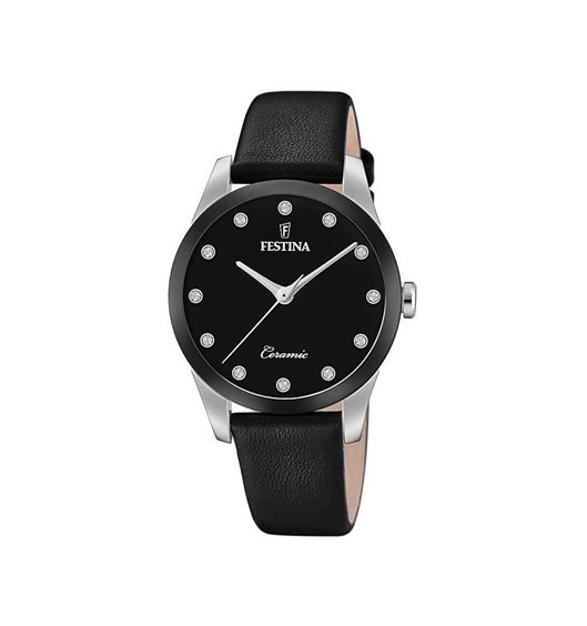 OROLOGIO FESTINA CON CASSA IN ACCIAIO ,GHIERA IN CERAMICA NERA, CINTURINO IN PELLE LISCIA NERO, QUADRANTE NERO CON INDICI DI SWAROVSKI, WR 5 ATM
