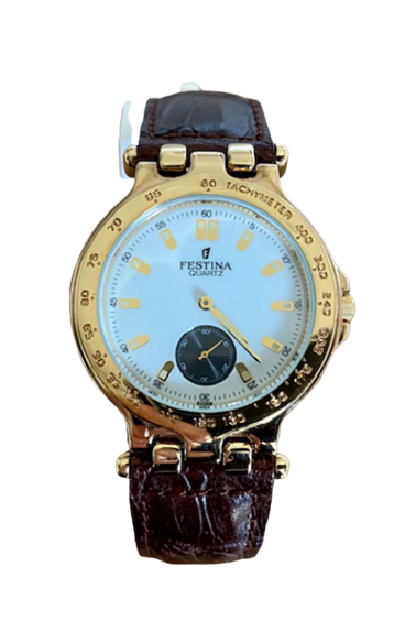 OROLOGIO MARCHIO "FESTINA" CON CASSA SNODATA IN ACCIAIO PLACCATA IN ORO GIALLO 18Ct, CINTURINO IN PELLE MARRONE, MOVIMENTO AL QUARZO CON CONTATORE SECONDI , QUADRANTE BIANCO CON CONTATORE SECONDI GRIGIO AL 6, INDICI E SFERE LUMIBRITE, WR 3 ATM. GARANZIA 2 ANNI