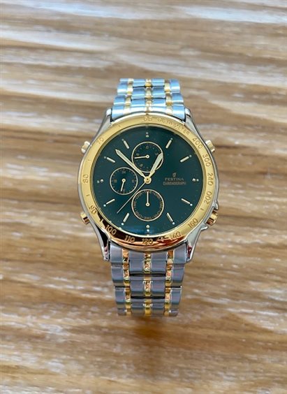 OROLOGIO MARCHIO "FESTINA" CON CASSA E BRACCIALE IN ACCIAIO BICOLORE, MOVIMENTO CRONOGRAFO MULTIFUNZIONE AL QUARZO ,VETRO MINERALE ,QUADRANTE VERDE SMERALDO, WR 3 ATM. GARANZIA 2 ANNI .