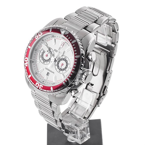 OROLOGIO FESTINA CRONOGRAFO IN ACCIAIO CON GHIERA ROSSA E QUADRANTE BIANCO CON DATARIO E CON INDICI E SFERE LUMIBRITE, FONDO A VITE RESISTENTE ACQUA 100 METRI