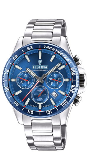 Orologio Festina Timeless. Cassa (mm 45) e cinturino in acciaio 316L. Quadrante blu con dettagli rossi, ghiera blu, datario tra 4 e 5. Cronografo al quarzo. Impermeabilità 10 atmosfere.