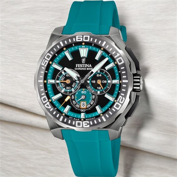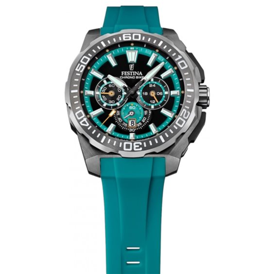 Cronografo Festina Chronobike. Realizzato in acciaio inossidabile 316L con cassa rotonda mm 45,5 (spessore mm14,4), vetro minerale. Quadrante nero e azzurro, cinturino in silicone azzurro. Cronografo movimento al quarzo. Impermeabilità 20 atmosfere.