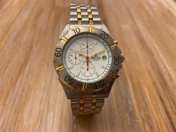 OROLOGIO FESTINA CON CASSA E ACCIAIO BICOLORE, MOVIMENTO CON CRONOGRAFO AL QUARZO, QUADRANTE BIANCO CON INDICI E SFERE LUMIBRITE, WR 5 ATM