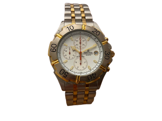 OROLOGIO FESTINA CON CASSA E ACCIAIO BICOLORE, MOVIMENTO CON CRONOGRAFO AL QUARZO, QUADRANTE BIANCO CON INDICI E SFERE LUMIBRITE, WR 5 ATM