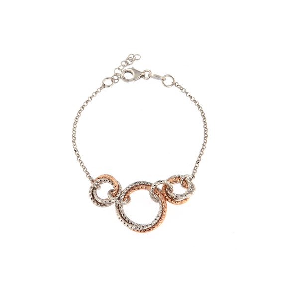Bracciale in argento 925 con maglia rolò e centrale di anelli intersecati in argento rodiato e rosè con lavorazione diamantata Lunghezza cm 17+2,5.