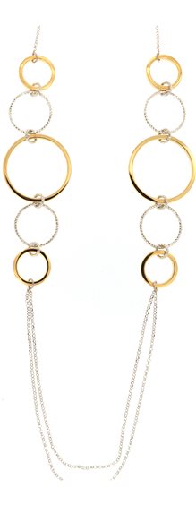 Collana in argento 925 composta da anelli diamantati rodiati diametro mm 23 alternati ad anelli lisci placcati oro giallo 18kt diametro mm 19,6 e 35,8. Chiusura a moschettone.