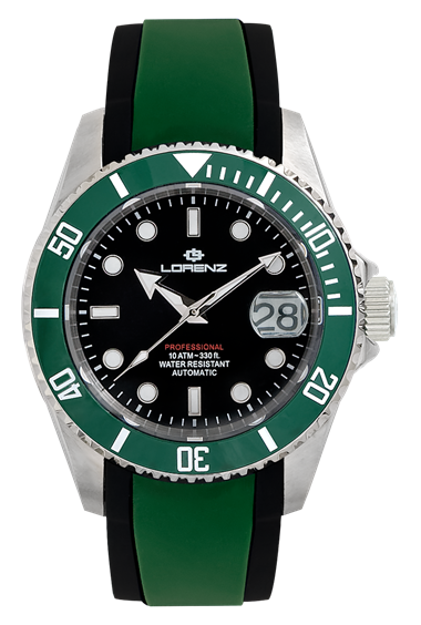 Orologio della collezione Classico Professional con movimenti automatico Seiko NH35. Cassa in acciaio, rotonda. Diametro 42MM. Vetro Zaffiro. Quadrante nero con indici. Ghiera verde. Cinturino in gomma a doppia iniezione con ardiglione. Fondello e corona a vite. Resistenza all'acqua 10 ATM.