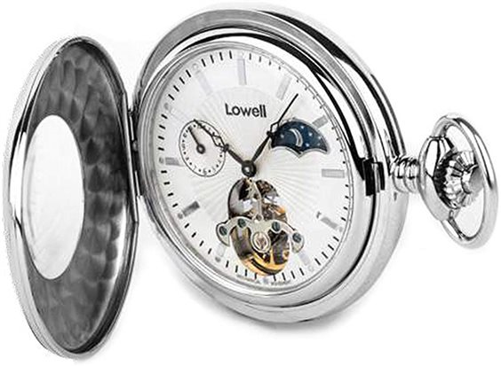 Orologio da tasca Savonette Lowell Fasi Luna ALLEN PO8114. Orologio da tasca con cassa in metallo lucido di diametro 51 mm, spessore 13 mm. Quadrante bianco con indici lucidi, Fasi giorno-notte a ore 2, indicatore secondi a ore 9. Orologio con movimento meccanico a carica manuale open heart. Catena inclusa.