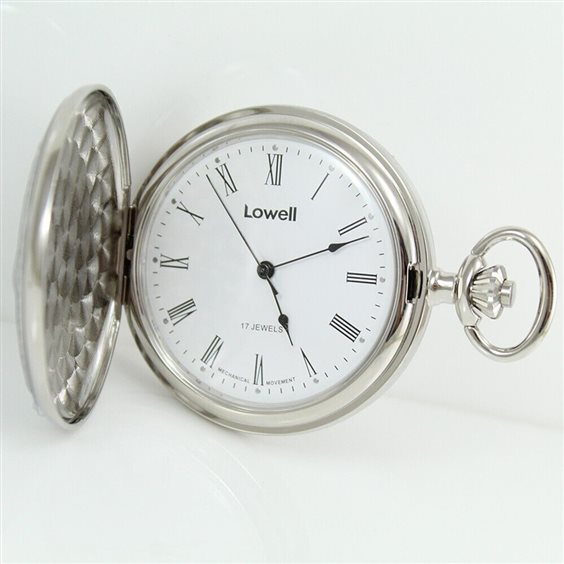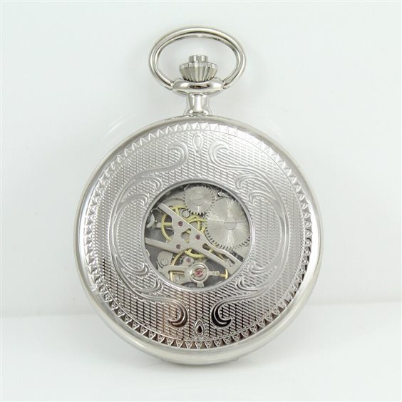 Cassa in metallo lucidato diam. 50 mm. - Spessore 13,5 mm. - Vetro plexi curvato - Corona a pressione con scatto - Fondello a pressione e a vista - Movimento meccanico a carica manuale finemente lavorato (17 jewels) - Indicazione ore, minuti e secondi - Coperchio finemente decorato - Movimento a vista - Catena in acciaio con clip