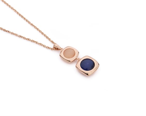 Collana in argento rosè con quarzo idrotermale di colore blu e albicocca.. Chiusura con moschettone e catenella per l'allungo. Oblò mm 16x16 e mm13x13.
