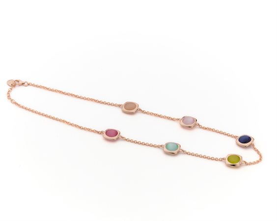 Collana in argento rosè con quarzo idrotermale di vari colori. Chiusura con moschettone e catenella per l'allungo. Oblò mm 13x13.