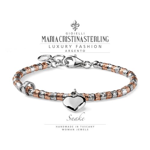 BRACCIALE DONNA COLLEZIONE SNAKE ARGENTO CON CIONDOLO A CUORE E CHARM • Bracciale Donna cm. 16+3 in Argento 925‰ bicolor • Chiusura Moschettone • Cuore argento • Interamente realizzato a mano • Made in Italy • Disegnato per Mariacristinasterling da Alessandro Magrino