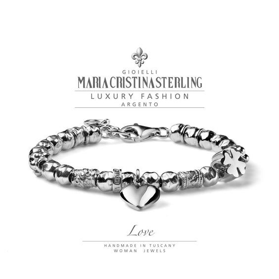 Bracciale in argento 925% lunghezza 16+3 cm. Charm quadrifoglio e pendente a forma di cuore. Interamente realizzato a mano.