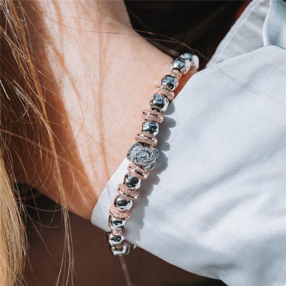 Il bracciale da donna della collezione Rose è realizzato con sfere martellate in argento 925 di diametro 6 mm e cerchi diamantati bagnato oro rosa. Al centro del gioiello si trova un raffinato charm a forma di rosa, la cui luminosità è data da zirconi cubici incastonati a mano. Il monile ha una lunghezza di 16 cm + 3 anellini di estensione e una comoda chiusura a moschettone. Lavorato a mano in Italia