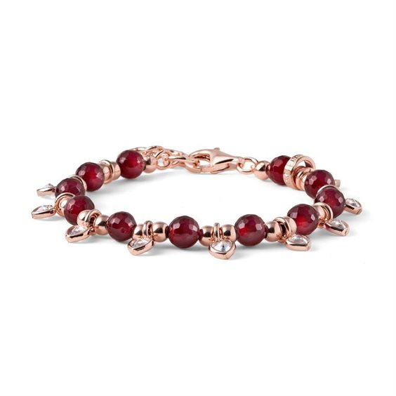 Bracciale in argento rosè 925 con agata rossa rubino mm 6 alternata a palline e cuoricini di zircone pendenti. Chiusura a moschettone e anellini per l'allungo.