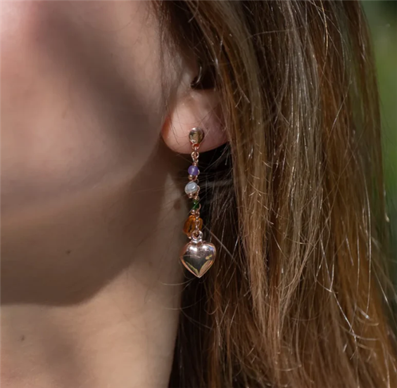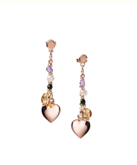 Caratteristica di questa collezione sono le pietre colorate annodate a mano in pendenti: perla, quarzi ametista, citrino e peridoto. Protagonista del gioiello è il ciondolo a cuore che dona romanticismo a questa creazione artigianale. Il monile dallo stile giovane ed elegante è realizzato in argento 925‰ bagnato oro rosa. Chiusura a farfalla