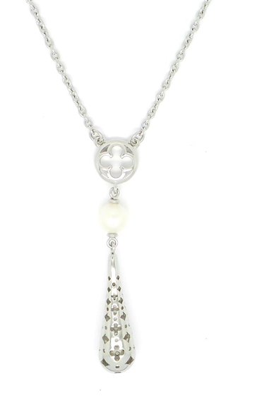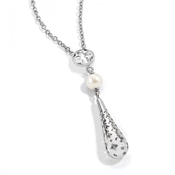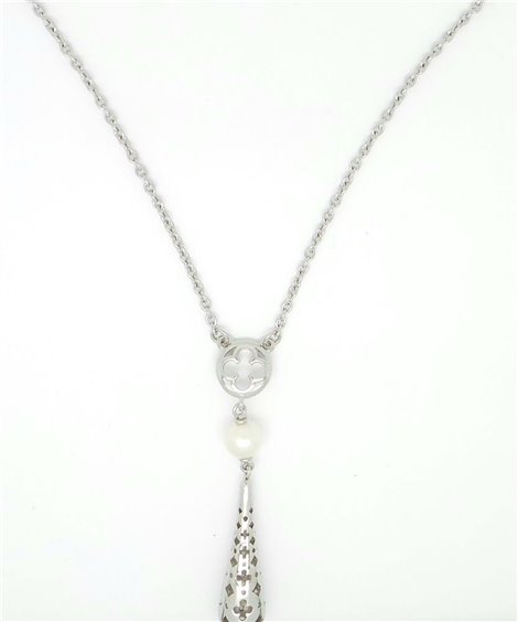 COLLANA IN ACCIAIO COLLEZIONE DUCALE CON CATENA ROLO DI LUNGHEZZA CM 45.PENDENTE CON CENTRALE CON PERLA NATURALE DI ø 8 E PENDENTE TRAFORATO DI ø 9.3 E DI LUNGHEZZA CM 5. PESO TOTALE GR 9