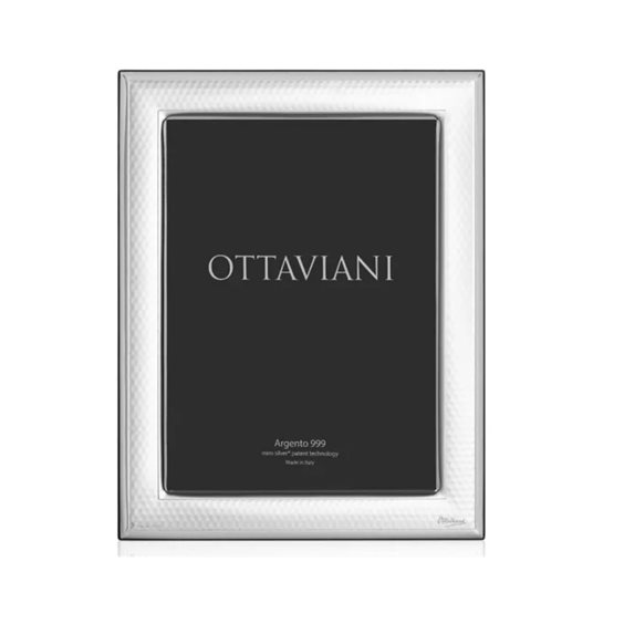 Portafoto OTTAVIANI della collezione BELLEZZA realizzato in argento 925%, misure interne: 18 x 24 centimetri, misure esterne 30 x 24,5 centimetri, retro legno.