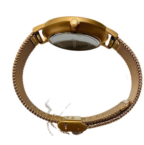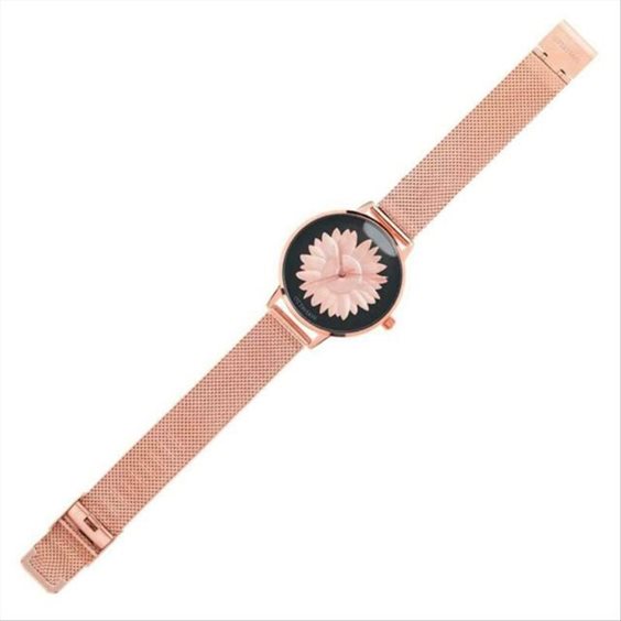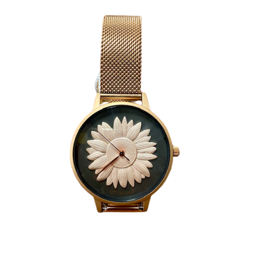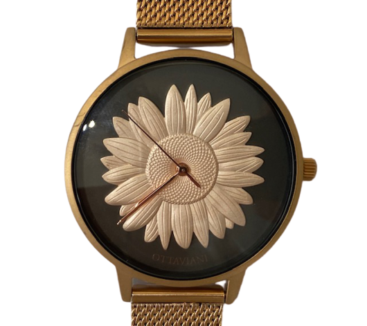 Orologio marca "Ottaviani" in acciaio placcato rosè con movimento al quarzo , quadrante nero con margherita in rilievo rosè , bracciale in tessuto milano regolabile, vetro minerale , wr 3 atm.