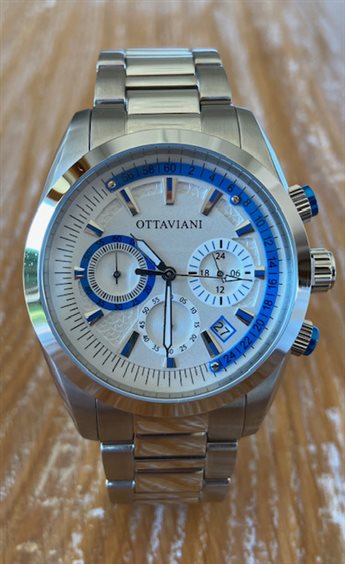 OROLOGIO OTTAVIANI CON CASSA E BRACCIALE IN ACCIAIO , MOVIMENTO CRONOGRAFO AL QUARZO CON DATARIO E 24 ORE, QUADRANTE COLOR ARGENTO CON PARTICOLARI AZZURRI, PULSANTI CRONO CON PARTICOLARI LACCATI DI AZZURRO, VETRO MINERALE , WR 10 ATM
