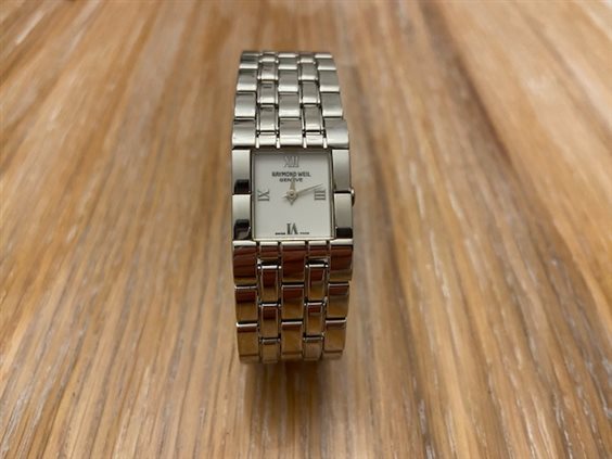 OROLOGIO RAYMOND WEIL CON CASSA E BRACCIALE IN ACCIAIO PLACCATO ORO BIANCO, CHIUSURA A SCOMPARSA ,QUADRANTE BIANCO CON 4 ORE ROMANE, VETRO IN ZAFFIRO, WR 3 ATM.