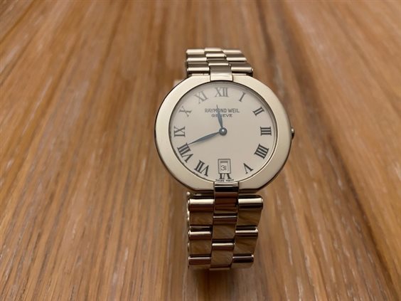 OROLOGIO RAYMOND WEIL IN ACCIAIO PLACCATO ORO BIANCO CON CHIUSURA DEPLOYANTE , MOVIMENTO AL QUARZO SWISS MADE, VETRO ZAFFIRO , QUADRANTE BIANCO CON INDICI SMALTATI BLU , DATARIO AL 6, WR 3 ATM .