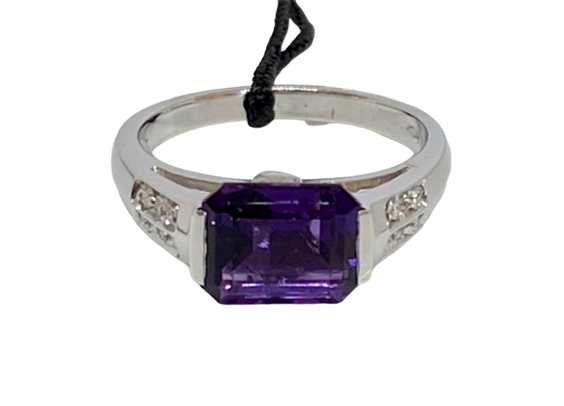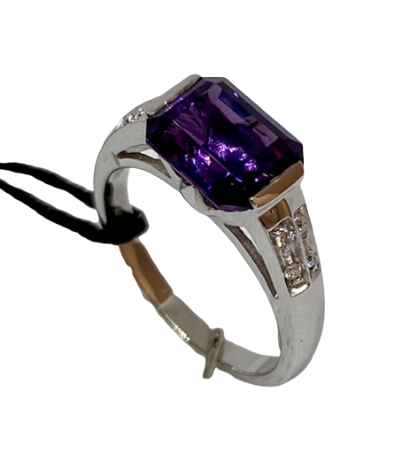 ANELLO MARCA "RECARLO" IN ORO BIANCO 18 Ct CON AMETISTA NATURALE VIOLE E 8 BRILLANTINI INCASTONATI A I LATI SUL GAMBO .
