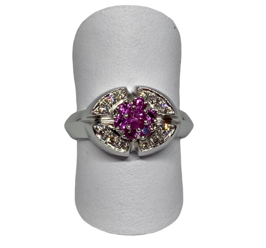 ANELLO MAISON "RECARLO" IN ORO BIANCO 18 Ct CON AL CENTRO UN FIORE DI ZAFFIRI ROSA (Ct 0,46) CONTORNATO DA DIAMANTI TAGLIO BRILLANTE PER Ct 0,18. L'ANELLO PESA GRAMMI 7,6 ED INTERNAMENTE E' MARCHIATO CON LA FIRMA "RECARLO " SU BOLLINO IN ORO PURO
