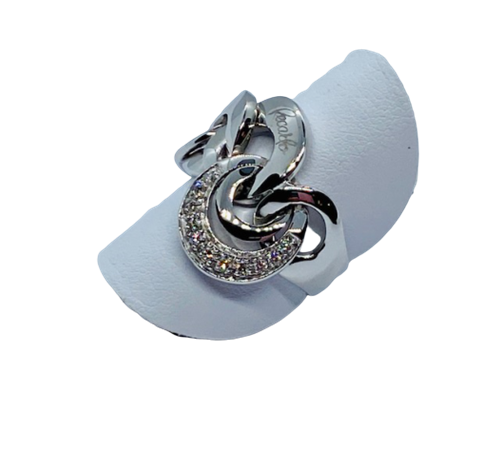 ANELLO MAISON "RECARLO" IN ORO BIANCO 18 K CON DIAMANTI TAGLIO BRILLANTE PER Ct 0,13. ANELLO CON DESIGN MOLTO ACCATTIVANTE COMPOSTO DA UNA CATENA DI ANELLI ASIMMETRICI CARATTERIZZATO DA UN DOPPIO ANELLO MOBILE CON UNA MEZZA LUNA DI DIAMANTI. ALL'INTERNO PUNZONE IN ORO PURO CON MARCHIO RECARLO
