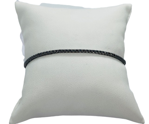 Bracciale classico a riviére di diamanti neri taglio brillante (1,20 ct totali) realizzato in oro 18 carati. Struttura flessibile che consente di seguire la curvatura del polso assicurando un comfort e una portabilità 24 ore su 24. Il bracciale misura 19 cm di lunghezza ed è 6,20 gr. di peso. Considerato nella gioielleria moderna il modello di bracciale per eccellenza, il tennis è veramente un “must have” per tutte le amanti del settore. In questa versione dark, estremamente grintosa, si presta anche ad essere reinterpretato in versione unisex.
