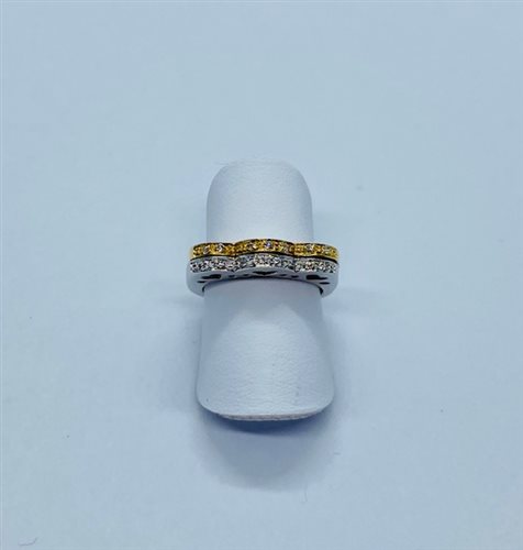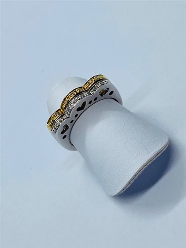 FEDINA IN ORO GIALLO E BIANCO 18 K CON DIAMANTI PER Ct 0,14. ANELLO COMPOSTO DA 1 ELEMENTO IN ORO GIALLO E 1 IN ORO BIANCO SALDATI TRA LORO CREANDO LATERALMENTE 3 CUORI TRAFORATI NELL'ORO