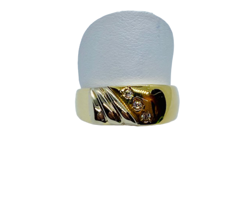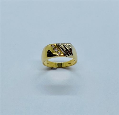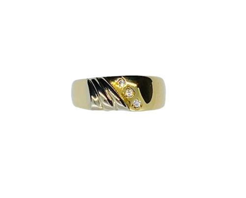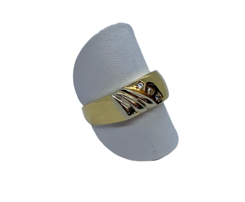 ANELLO IN ORO GIALLO E BIANCO 18 K CON INCASTONATO SULLA PARTE IN ORO GIALLO 3 ZIRCONI IN DIAGONALE. FINITURA LUCIDA .