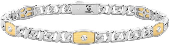 Bracciale in argento 925 con targhette stondate con oro 18ct. Chiusura di sicurezza a innesto.