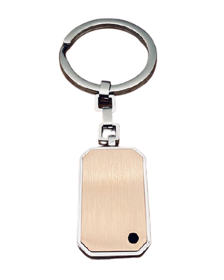 Portachiavi marca "Zancan" in acciaio con parte superiore a finitura satinata trattata pvd oro rosa e zircone nero. Possibilità di personalizzazione con una incisione a piacere . La targa misura 3x1,8 cm